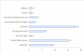 No conjunto das entrevistas destaca-se a questão do transporte (N=18); a falta de material didático (n=15), nomeadamente dos manuais escolares e outro material como esquadros, compassos, réguas, etc. material específico para determinadas aulas, tendo sido também referidas as condições das batas (estado, limpeza), cujo uso é obrigatório nas escolas públicas; ainda a alimentação (N=9) é novamente mencionada como problemática para grande parte dos estudantes; e também a falta de acompanhamento dos pais (N=2) é apontada como um dos problemas que afetam os alunos.