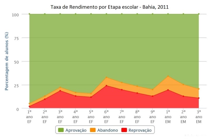 Observa-se que houve aumento das taxas de aprovação, para ambos os Estados e, consequentemente, a redução das demais taxas (reprovação e abandono). A análise das taxas de rendimento comprova que, se as taxas de aprovação na Bahia e em Minas Gerais estão aumentando, logo as de reprovação diminuindo, há proporcionalmente menos alunos repetentes e relativa estabilização do fluxo escolar. Entretanto, os ritmos e patamares dessa diminuição da repetência são diferentes, o que sugere persistência das desigualdades regionais em médio prazo. Assim, infere-se a existência de correlação entre a taxa de fecundidade, aprovação e matrículas iniciais e isso explica o porquê das matriculas estarem diminuindo nessas UF’s.