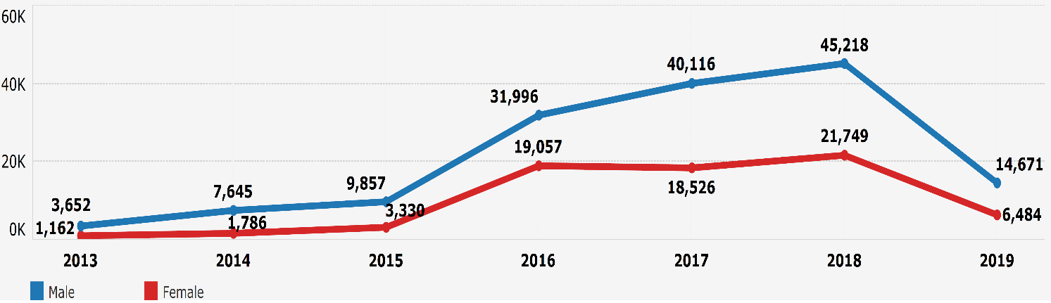 Regarding asylum application per gender (Figure 1), in 2013, 4,814 applications were recorded with a monthly average of 688 applications. The percentage difference between 2013-2014 increased at 14.3 %. In 2014 respectively, 9,431 applications with a monthly average of 786 applications, with a percentage difference between 2014-2015 increased at 39.8 %. In 2015, 13,187 applications with a monthly average of 1,099 applications, with a percentage difference between 2015-2016 increased at 287,1 %. In 2016, 51,053 applications with a monthly average of 4,254 applications, with a percentage difference between 2016-2017 increased at 14.9 %. In 2017, 58,642 applications with a monthly average of 4,887 applications, with a percentage difference between 2017-2018 increased at 14.2 %. In 2018, 66,966 applications with a monthly average of 5,581 applications. In 2019, 21,155 (April 30, 2019) applications with a monthly average of 5,289 applications, with a percentage difference between 2018-2019 at 5.2%.