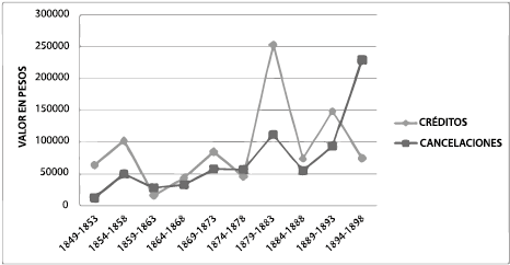 Otro caso fue el crédito otorgado el 30 de enero de 1868 por Rundencido Cantillo a favor de la señora Mercedes Felipe por $300 pesos, el cual no generaba intereses si pagaba en un solo plazo y se cobraría una tasa usurera del 2 % mensual si era cancelado después de un mes. La fecha de pago fue fijada en nueve meses prefijos y nueve más si no era cancelado en el tiempo estipulado8. La deudora no pagó la obligación en el plazo convenido por falta de solvencia económica y prolongó su cancelación hasta 1875, es decir, 7 años después de lo acordado legalmente9.
